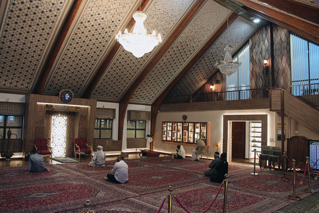 Stepping into the masjid, one is immediately struck by the richness of detail. The original timber roof structure remains intact, now complemented by intricate geometric ceiling patterns that introduce a distinctly Islamic visual language.
