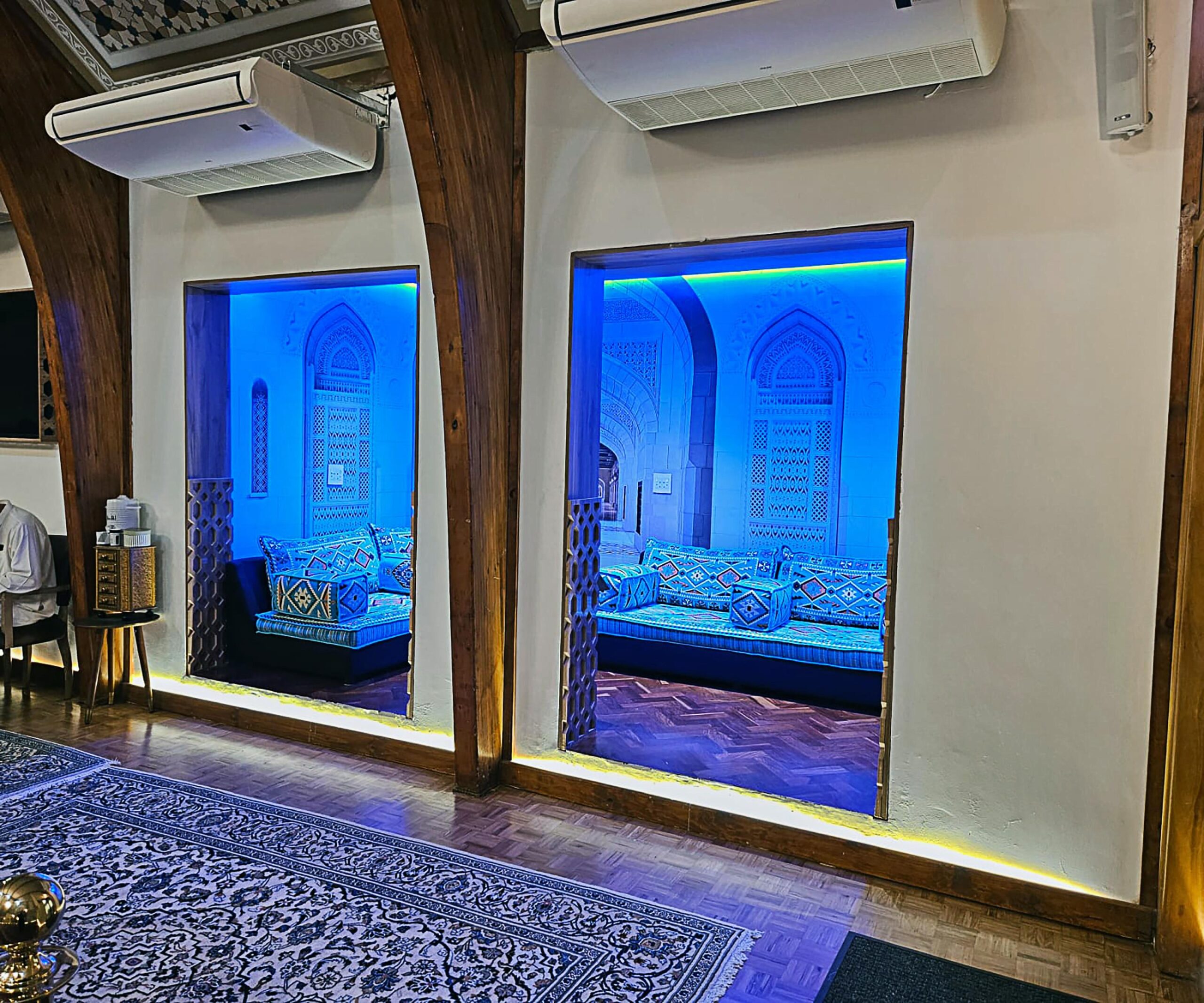 The polished parquet flooring further anchors the space, with handwoven Persian-style carpets arranged in traditional formation, reinforcing both familiarity and spiritual focus.