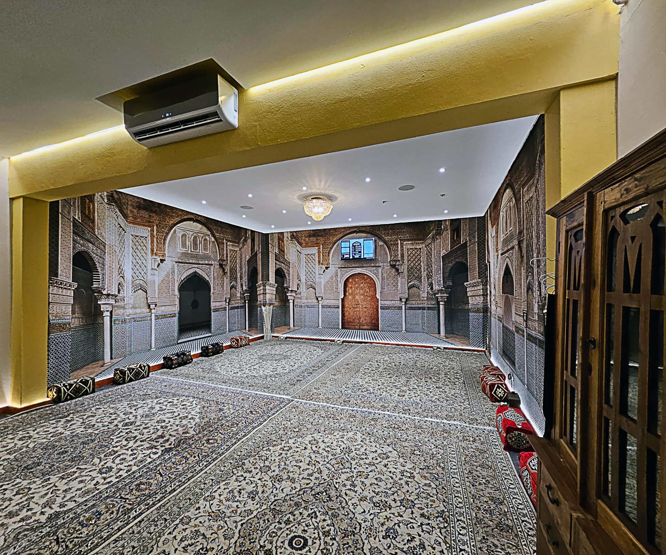 At the heart of the space, the mihrab forms a powerful focal point — framed by detailed woodwork, layered arches and a subtle halo of light. Surrounding this are elements that reflect craftsmanship and depth: laser-cut wooden screens, backlit panels, ornamental features and carefully composed architectural framing.